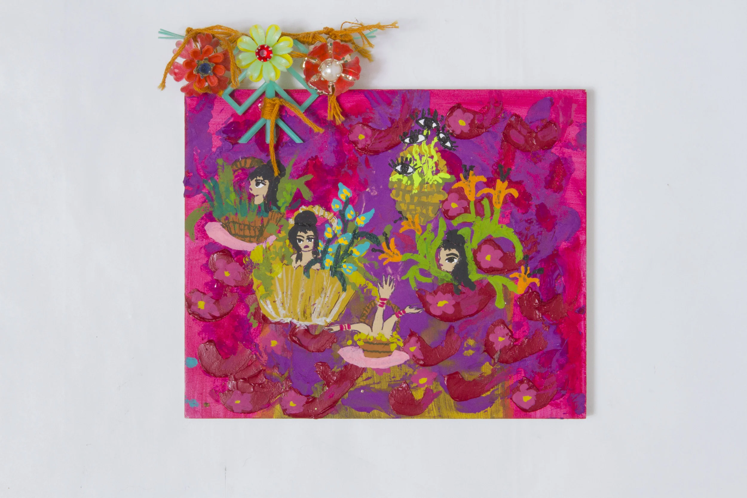 acrylic, gouache, found objects, embroidery thread, pendant on (salvaged) redwood panel